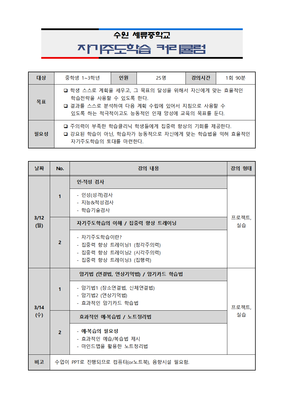 자기주도학습 향상 트레이닝 수업 커리큘럼입니다.