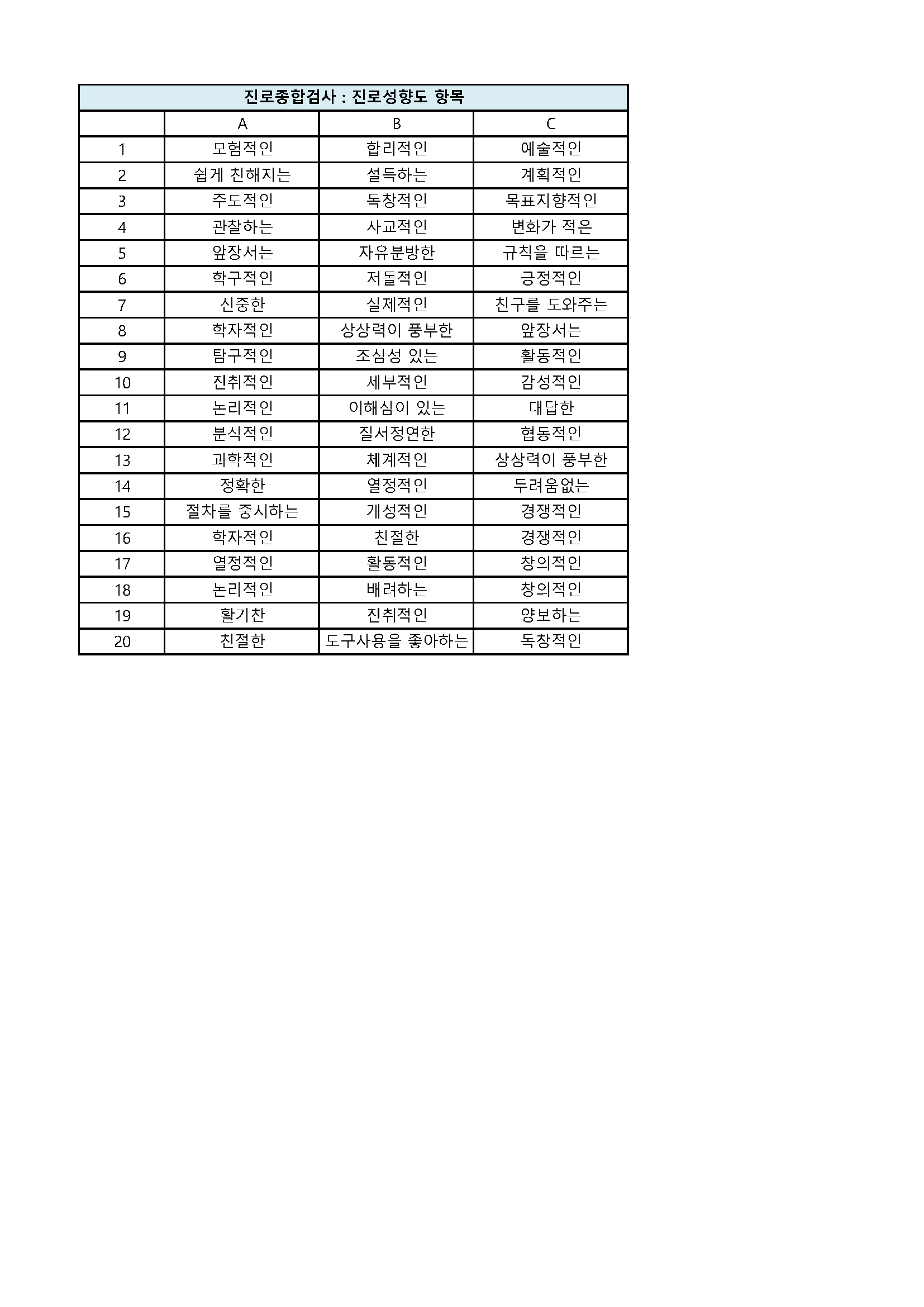 진로종합검사의 기본 소스가 되는 기본 평가 항목의 다음과 같으며,