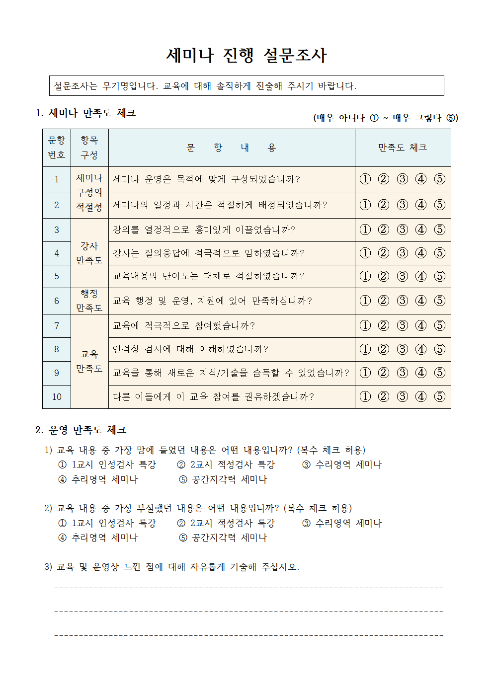 세미나형 수업 진행시 학생들에게 나눠주는 설문조사지입니다.