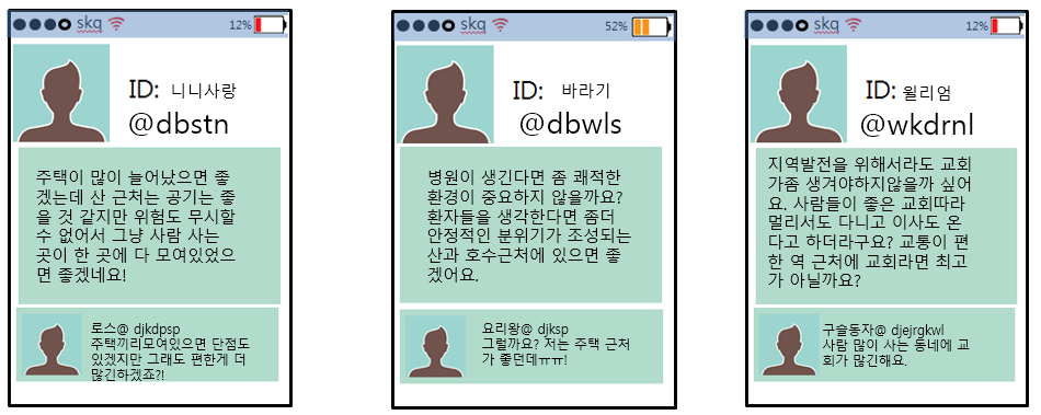 조원들은 주민들의 의견에 반하여 의견을 조합하는 이유를 설정해야 하며, 실제 주민들과 대립할 때 본인들의 의견을 논리적으로 설명할 수 있어야 합니다. 주민들의 의견은 공청회, 토론회 등으로 이루어지므로 가장 합당한 논리 프로세스가 있어야겠죠?