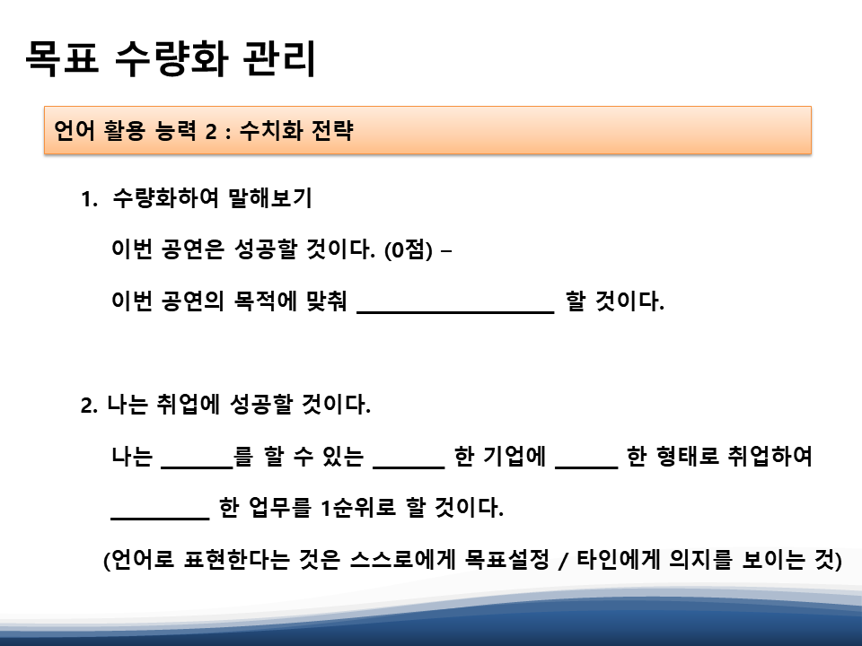 일반적인 목표관리는 대부분 동기 부여나 할 수 있다, 해야 한다 등의 이야기를 하지만, 빅데이터 분석에서는 그런 것들을 경계하라고 합니다. '무엇인가를 할 수 있다'는 의미가 없으며, 언제 어디서 어떤 방식으로 무엇을 해낼 수 있는지를 수량화해서 목표를 세워야 게임에서 레벨업 하듯이 단계별로 자신의 목표 달성을 가시적으로 보여줄 수 있기 때문입니다.
