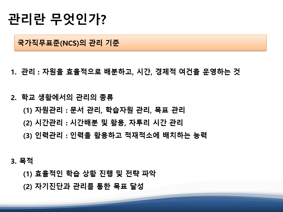 먼저 NCS 기준으로 관리의 종류에 대해 설명하고 자원관리능력이 NCS 영역 및 공기업 입사시험, 취업에서 다양한 영역에서의 활용에 대해 설명합니다.