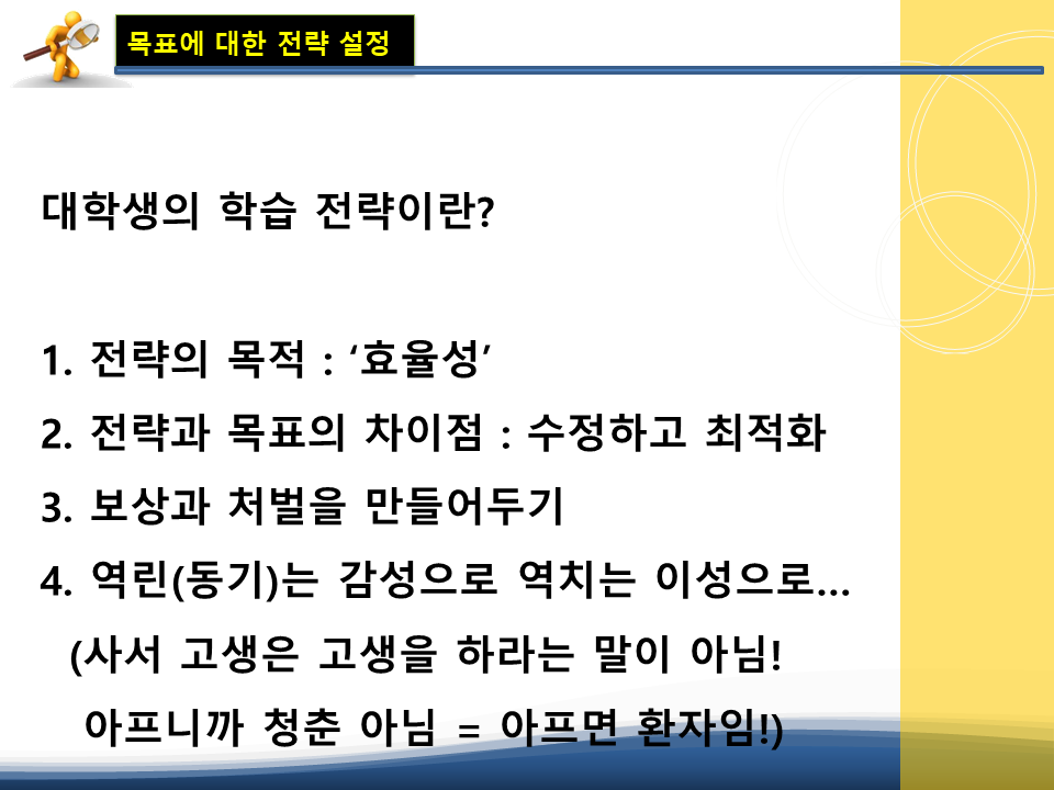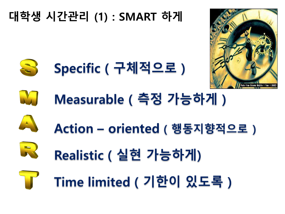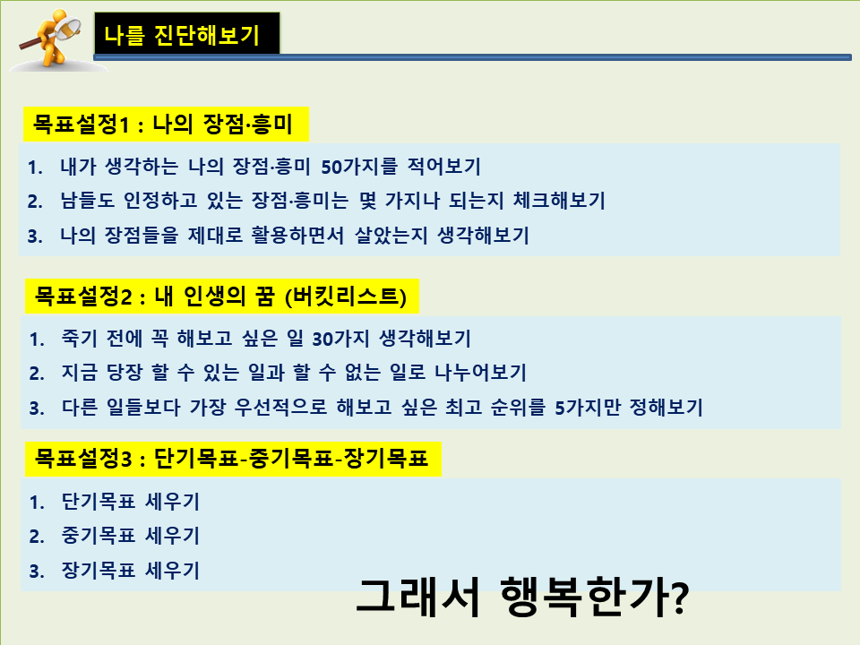 오늘은 한국빅데이터교육협회 장혁 대표님께서 각 대학 및 한국문화원 등에서 수업한 목표설정을 통한 자원관리 수업 내용입니다. 장혁 대표님은 통계 및 빅데이터를 활용한 목표설정 기법 분야에서 독보적인 수업 커리큘럼을 갖고 계십니다. 열심히 정리한 저는 웅이 연구원입니다. ^^