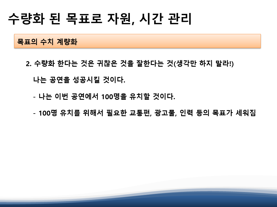 각 기업체에서 목표 달성을 하기 위해 세우는 다양한 전략 기법을 소개하면서 자신의 목표를 수량화하는 기본 원칙들을 설명하고 엑셀이나 인포그래픽, 한글 문서 등 일상적인 프로그램으로 그 수치를 명료화, 시각화 하는 방법도 설명합니다.