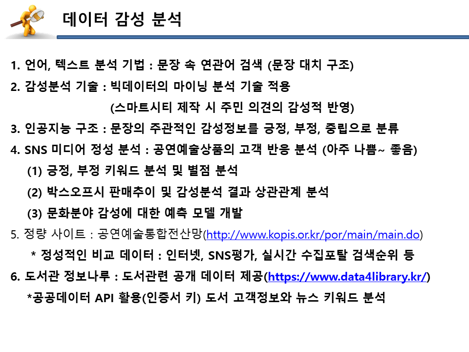 다양한 감성 분석 및 공공데이터 추출 사이트들을 설명하셨구요.