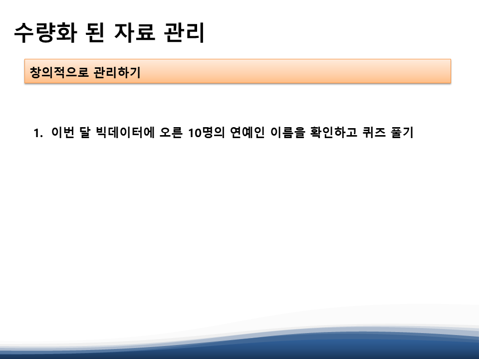 저희 홈페이지에 무척(?) 많이 올라와 있는 빅데이터 관련 아이스 브레이킹 게임 중 한 두가지를 하셨구요....
