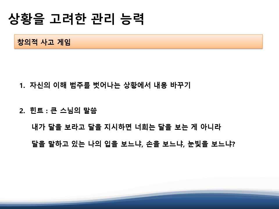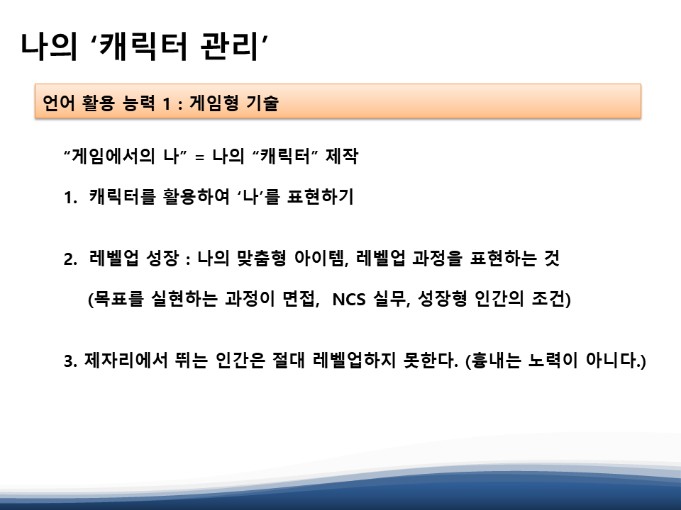 목표 설정을 위해 자신을 게임 속의 '캐릭터'로 수치, 수량화 해보고 자신을 레벨업 하기 위해 필요한 게임식 성장 과정에 대한 설명과 자기 수량화 법칙을 말씀해주셨습니다.