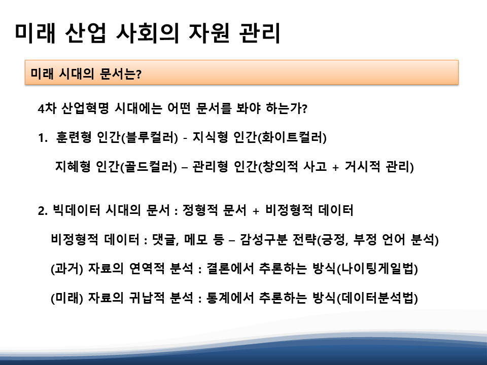 빅데이터를 공부한 분들은 잘 아시겠지만, 비정형적 문서와 SNS 등 감성적 언어 표현이 담긴 자료들을 분석해서 사람들의 생각을 읽고, 그 생각을 나의 목표 달성에 활용하는 방법을 설명해 주셨습니다. 저는 개인적으로 감성언어를 인공지능 명령어로 바꾸는 데이터 분석 기법 수업이 더 좋았는데, 요즘은 거의 SNS 분석법을 많이 말씀하시더라구요.