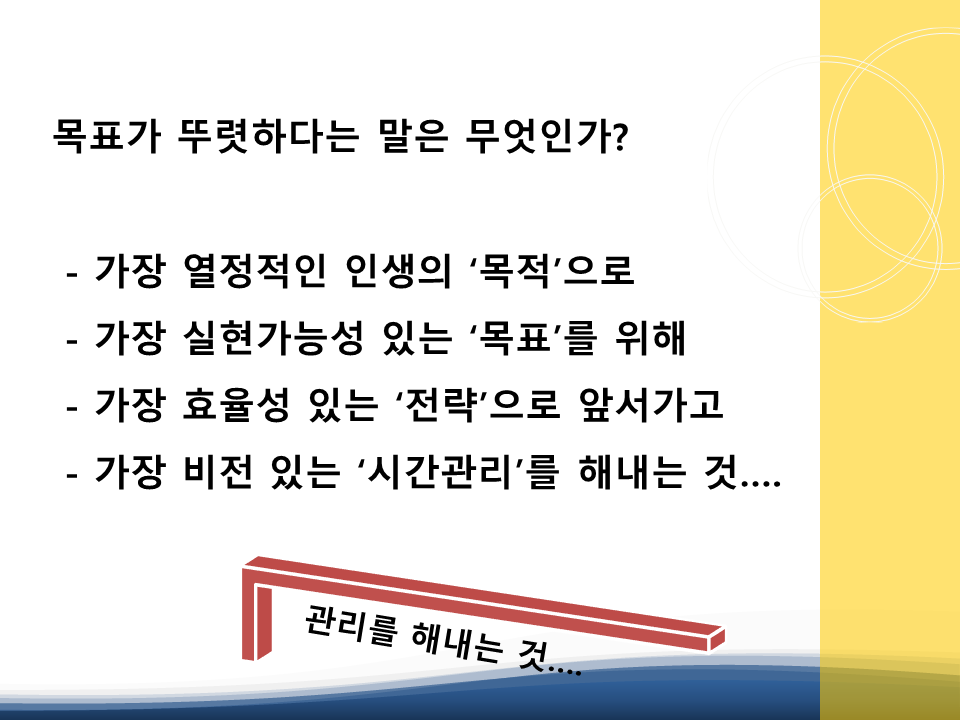 오늘은 한국빅데이터교육협회 장혁 대표님께서 각 대학 및 한국문화원 등에서 수업한 목표설정을 통한 자원관리 수업 내용입니다. 장혁 대표님은 통계 및 빅데이터를 활용한 목표설정 기법 분야에서 독보적인 수업 커리큘럼을 갖고 계십니다. 열심히 정리한 저는 웅이 연구원입니다. ^^