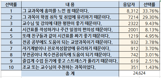 이번에 소개할 항목은 2019년도 대학생들이 교양 과목을 선택하는 기준 설문 조사입니다.
