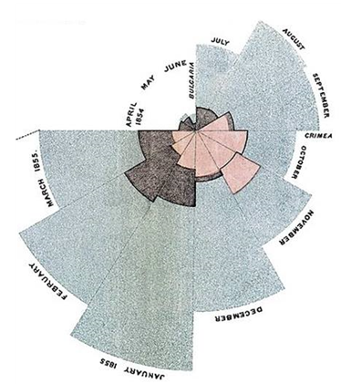 월별 사망 통계를 내면서 면적의 넓이로 사망유형을 시각적으로 표현했던 것이죠.