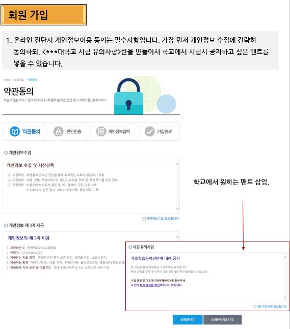 온라인 진단시 회원가입은 정말 간단합니다. 먼저, 법적으로 꼭 해야 하는 개인정보 동의를 클릭만 하고 나면