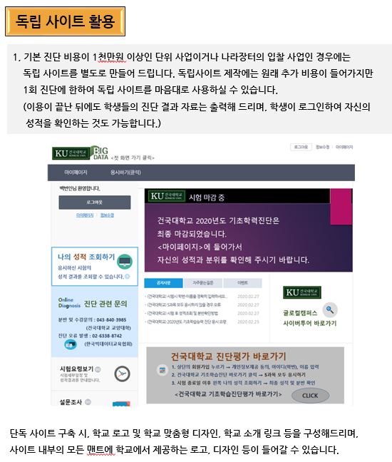 반면 독립사이트를 활용하면, 학교 자체용으로 구성된 진단 사이트를 이용할 수도 있답니다.