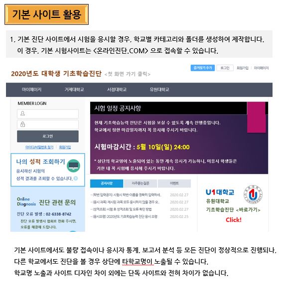 온라인 진단 사이트는 기본형으로 대학이 활용할 수 있는 사이트와 독립형으로 특정 대학만을 위한 사이트가 있답니다.