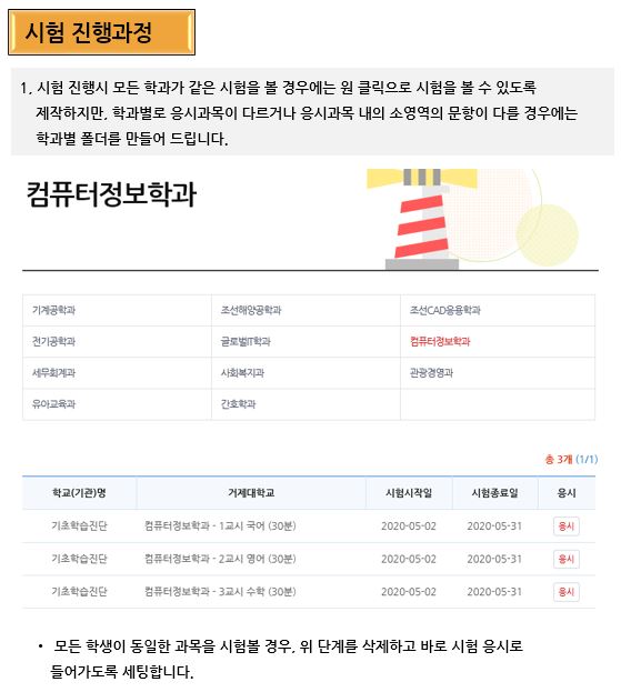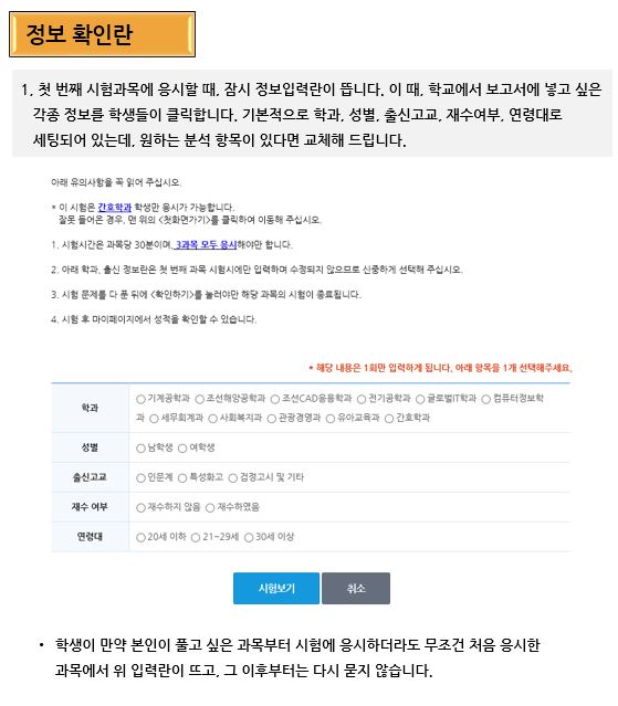 또 전문대학의 경우, 대학 특성에 맞는 기초학습능력진단을 보기 위해 교과목을 학과별로 선택하는 경우가 많습니다.