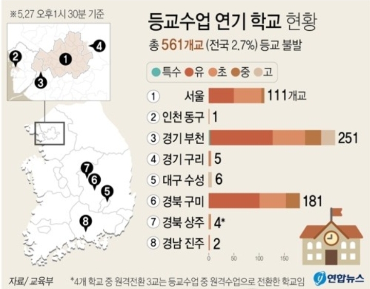 2.7%인 561개교의 등교가 불발되었어요.