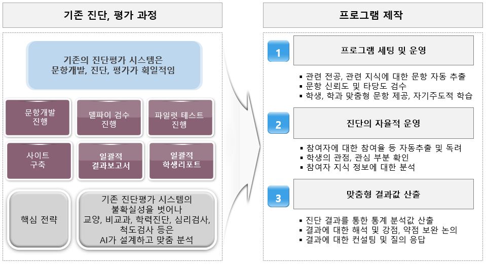 현재 지금은 AI 분석이 활성화되면서 이러한 진단 및 분석을 대학의 각 전공학과, 기업의 특정부서, 중고등학교 등에서 자율적으로 진행하기를 원하는 분들이 많습니다. 그러나 AI의 발전과 달리 교육시장의 AI 이해도는 낮은 편이며, AI를 활용한 맞춤형 진단 사이트를 원하는 수요는 있어도 공급이 부족한 현실입니다.