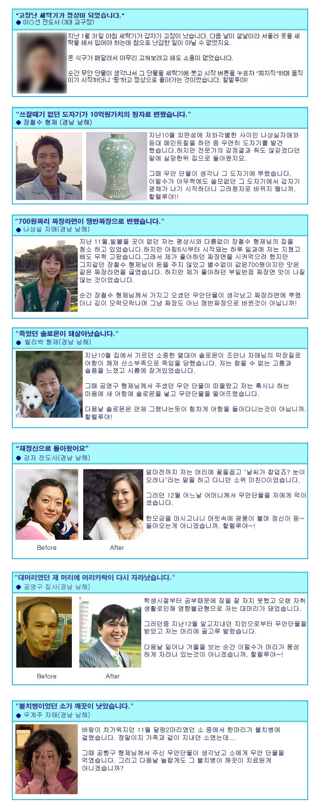 맨위에 '고장난 세탁기가 정상이 되었습니다'는 실제로 무안단물 광고에 사용된 설명입니다.
